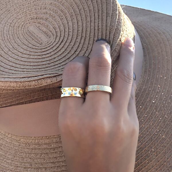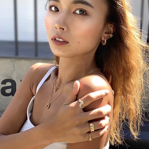 平打ちのデザインと、太さのある素材が相まって、ミニマルながらも存在感があります。また、でこぼこ加工によって、光の反射と影の演出で、リングに奥行き感が生まれ、シンプルなコーディネートにもワンポイントとして活躍します。