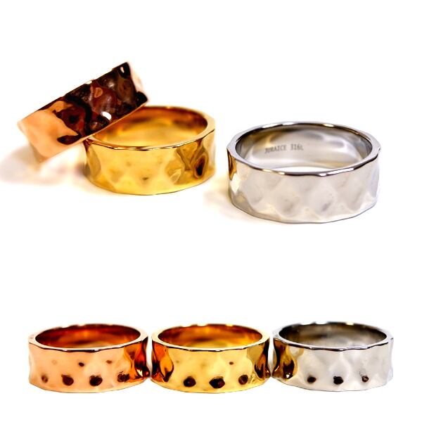 高級感のある平打ちデザインに太めのサージカルステンレス316L素材を使用した、男女問わず人気のでこぼこリング。手元に存在感を与え、毎日のコーディネートを引き締めます。