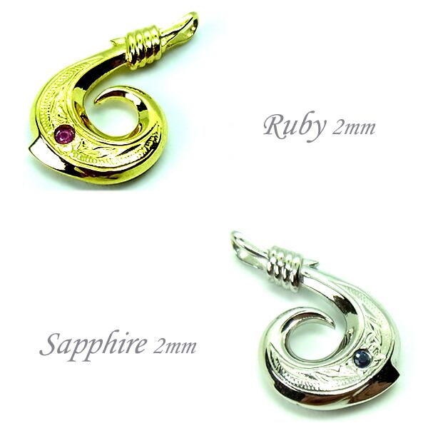 フィッシュフックは、ハワイの伝統的なデザインであり、幸運や繫栄の意味を持っています。また、ネックレスには天然ルビーと天然サファイアがセッティングされており、華やかさと高級感をプラスしています。